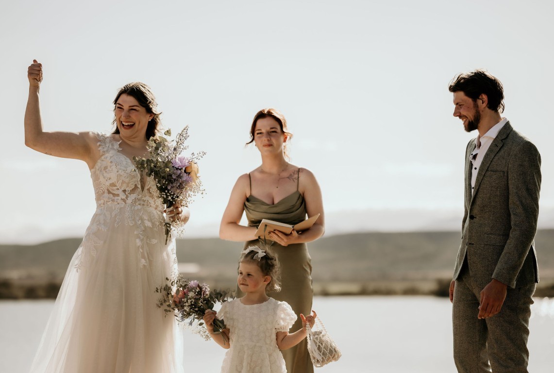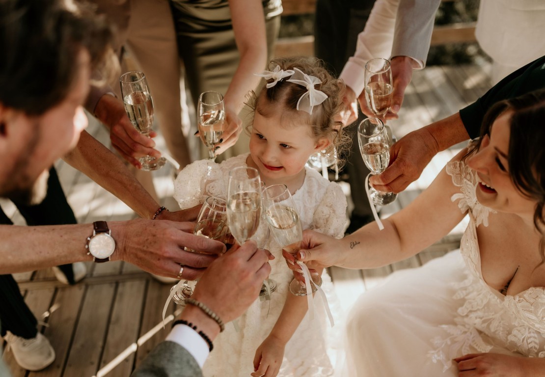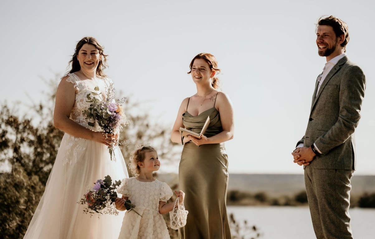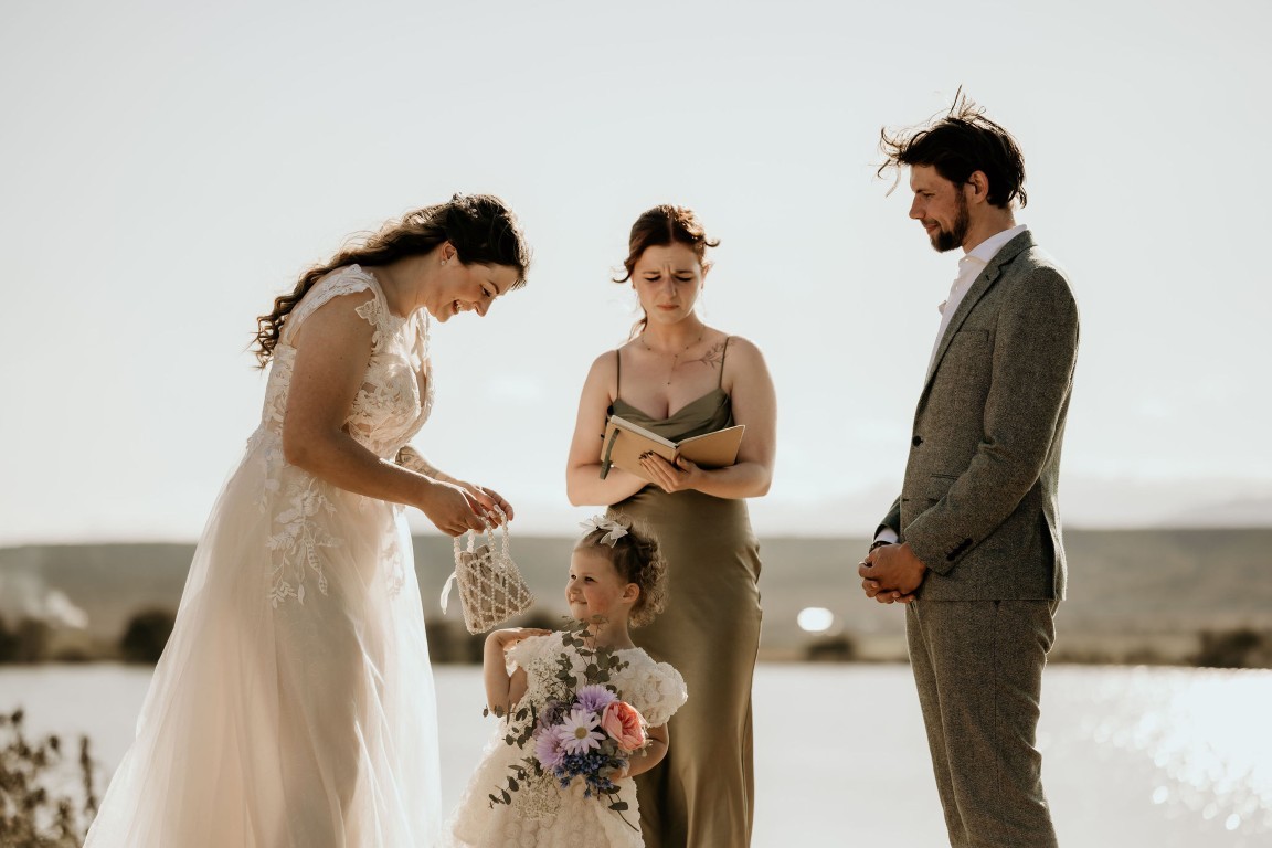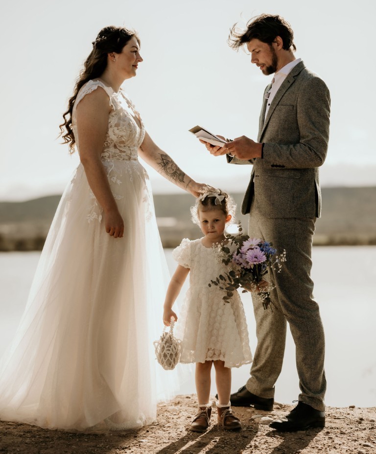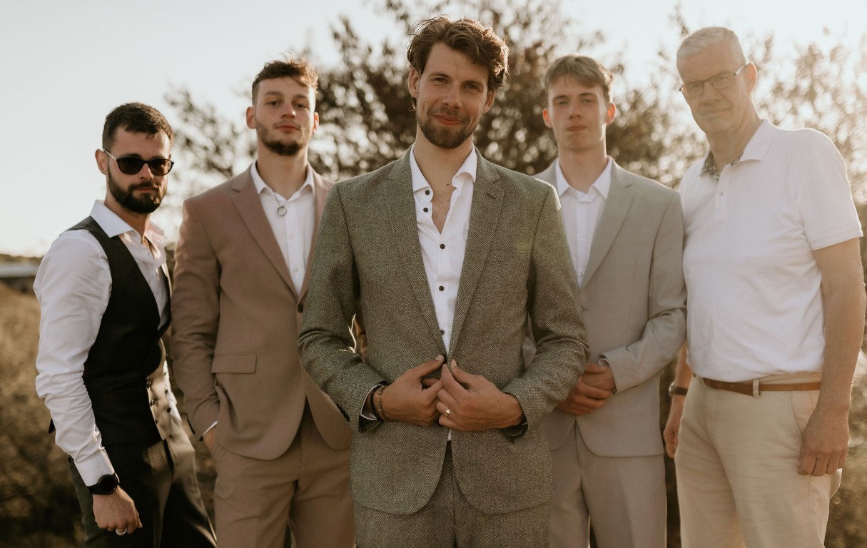 Op het afgesproken tijdstip haalt de bruidegom iedereen op en gaan ze klaarstaan bij het water. Bascha en hun dochter zijn de fotograaf aan het halen en komen er zo aan, verteld de bruidegom.
