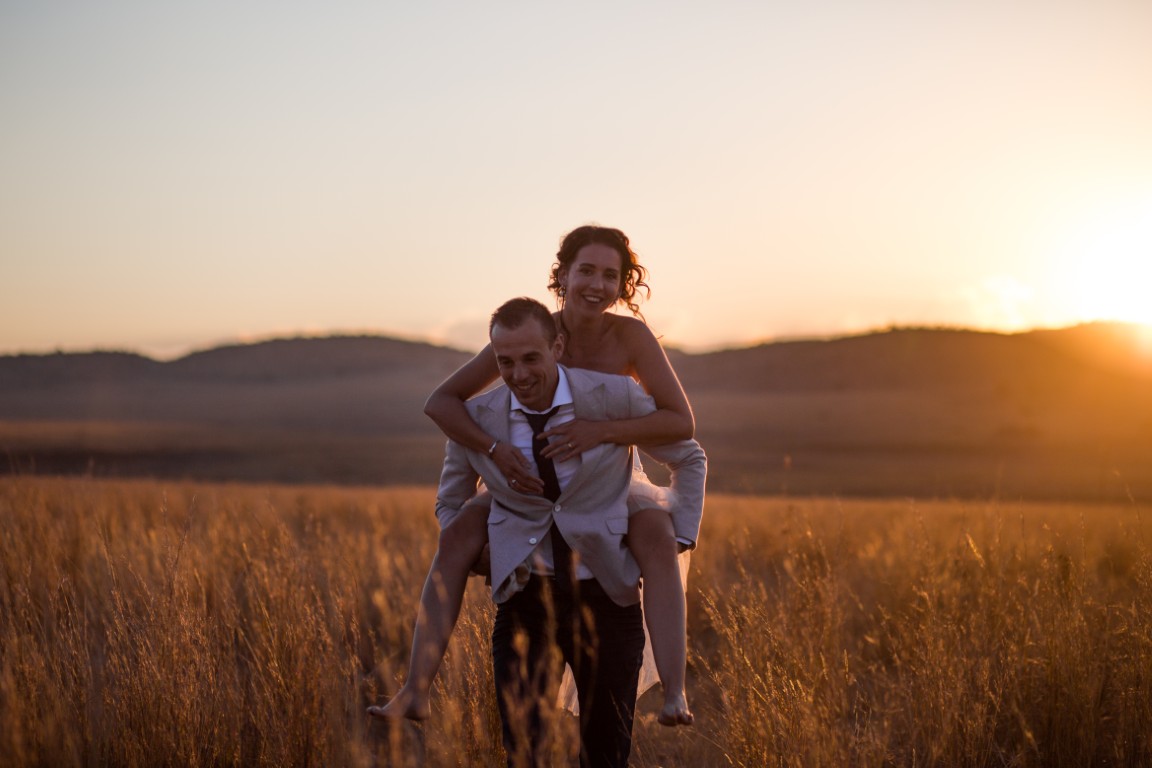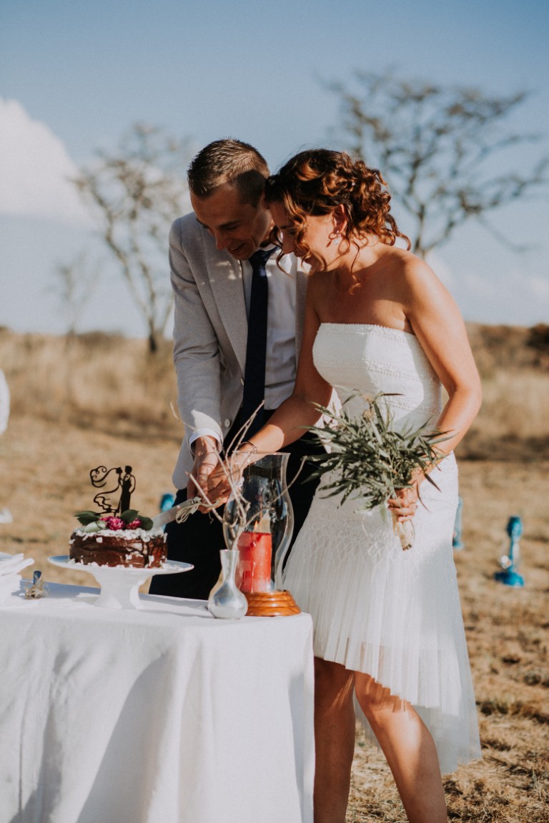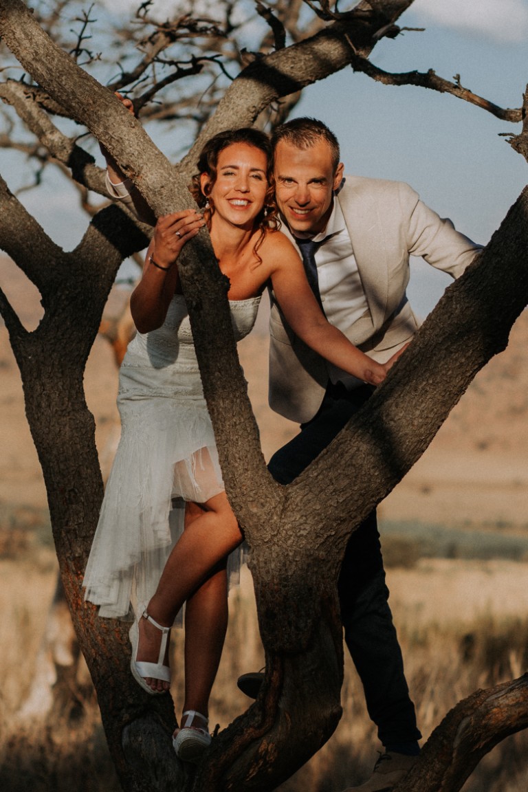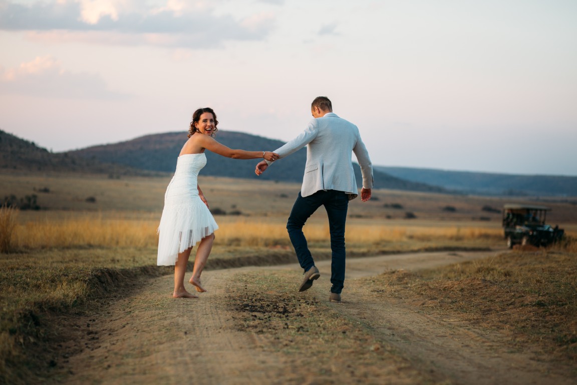 Het bruidspaar besloot dat ze liever de leeuw gingen volgen dat de fotoshoot af te maken. Dus reden ze een tijdje door de bush, achter de leeuw aan die op zijn gemak voor hun uit liep. Geen andere auto’s en toeristen. Een hele mooie privé ervaring.